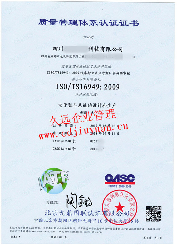 IATF16949汽車質量管理體系認證證書